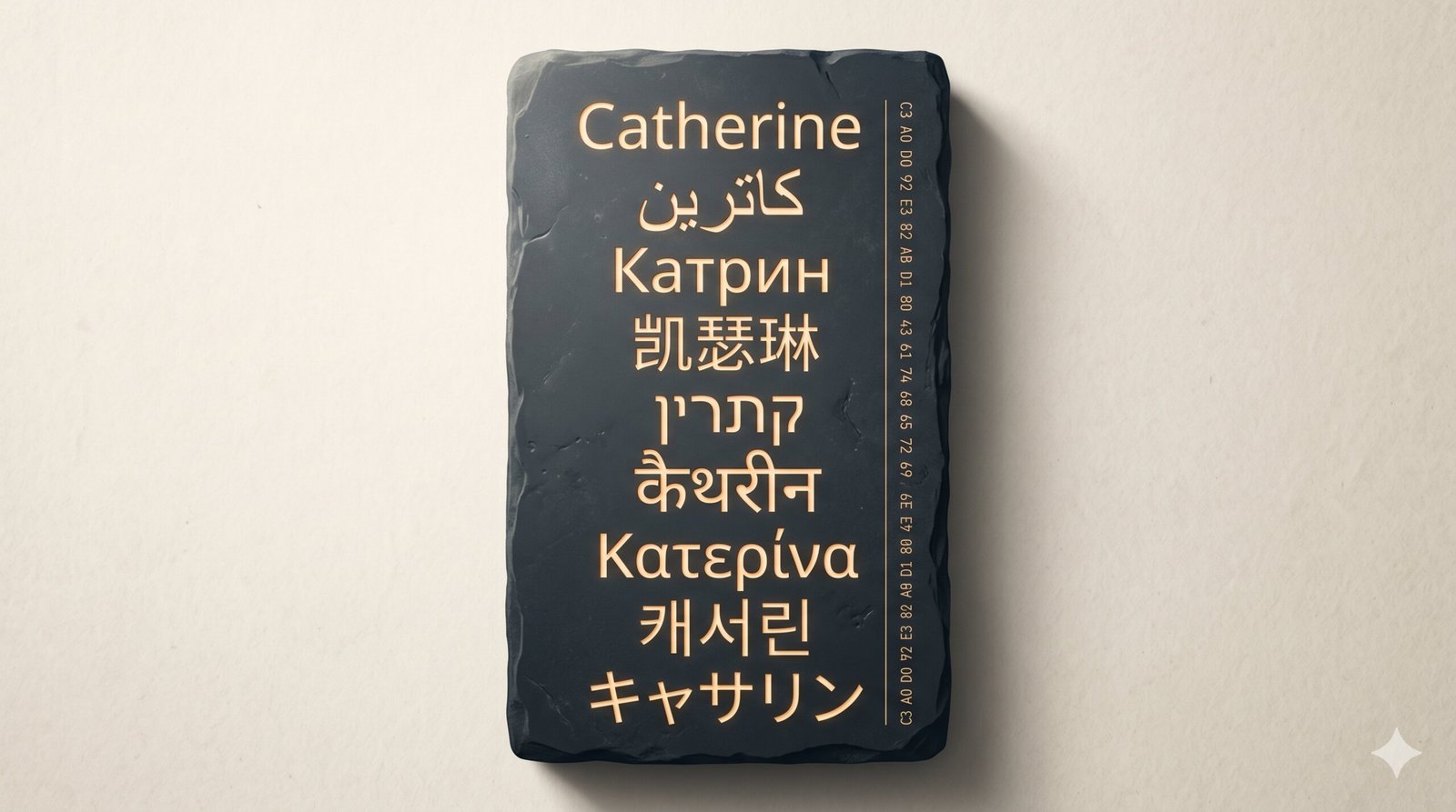 - script: direct transliteration into a non-Latin script (“Catherine” → “كاثرين”)