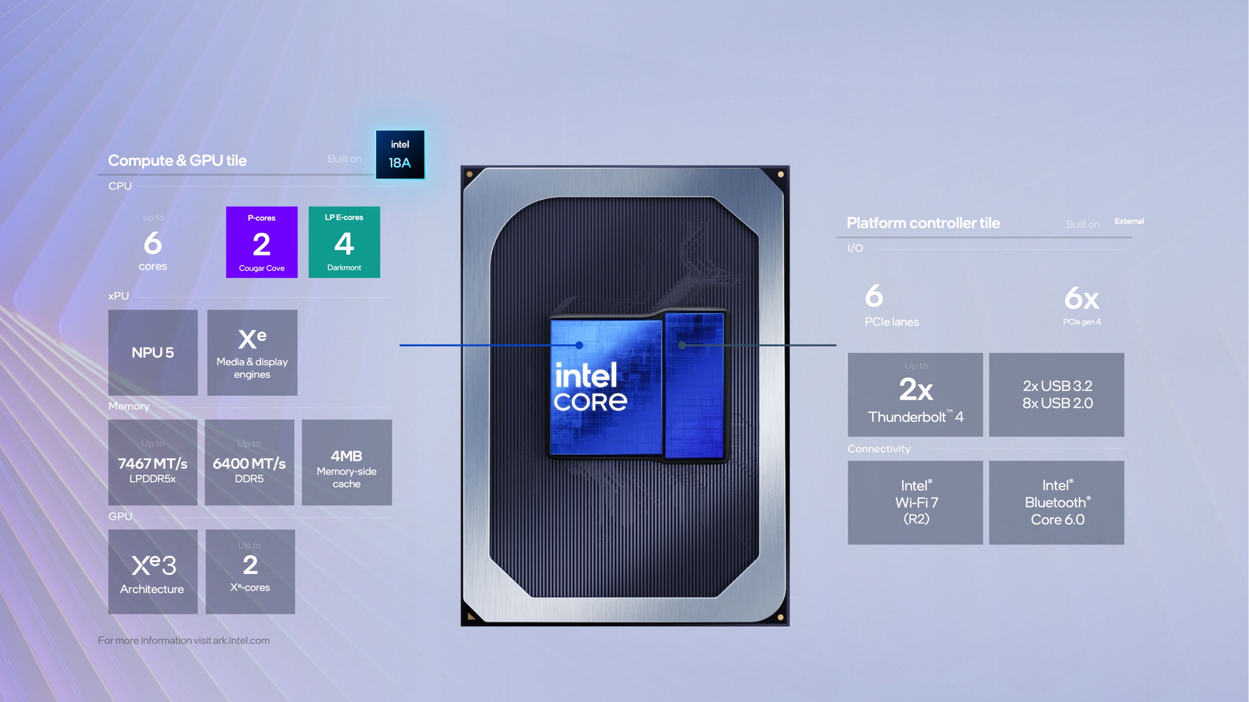 Each chip uses two silicon tiles: a compute tile that includes a CPU with up to two Cougar Cove P-cores and four Darkmont E-cores; an integrated GPU with one or two of Intel’s latest-generation Xe3 GPU cores; and (usually) an NPU capable of up to 17 trillion operations per second (TOPS). A separate platform controller tile built on an unspecified non-Intel process provides up to two Thunderbolt 4 ports, Wi-Fi 7 and Bluetooth 6.0 connectivity, and six PCIe 4.0 lanes for external connectivity. All of the chips support up to 48GB of LPDDR5X-7467, or up to 64GB of DDR5-6400, and use a base power level of 15 W and maximum boost power level of 35 W.