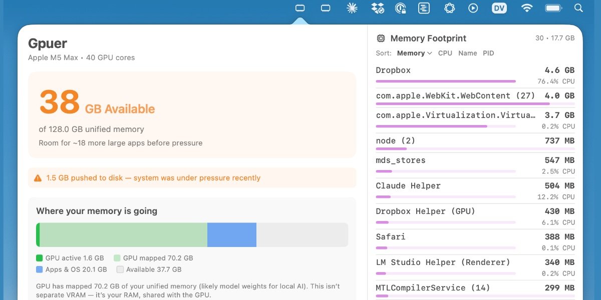 This morning I caught Gpuer reporting that I had just 5GB of memory left when that clearly wasn’t the case (according to Activity Monitor). I pasted a screenshot into Claude Code and it adjusted the calculations and the new numbers look right, but I’m still not confident that it’s reporting things correctly.